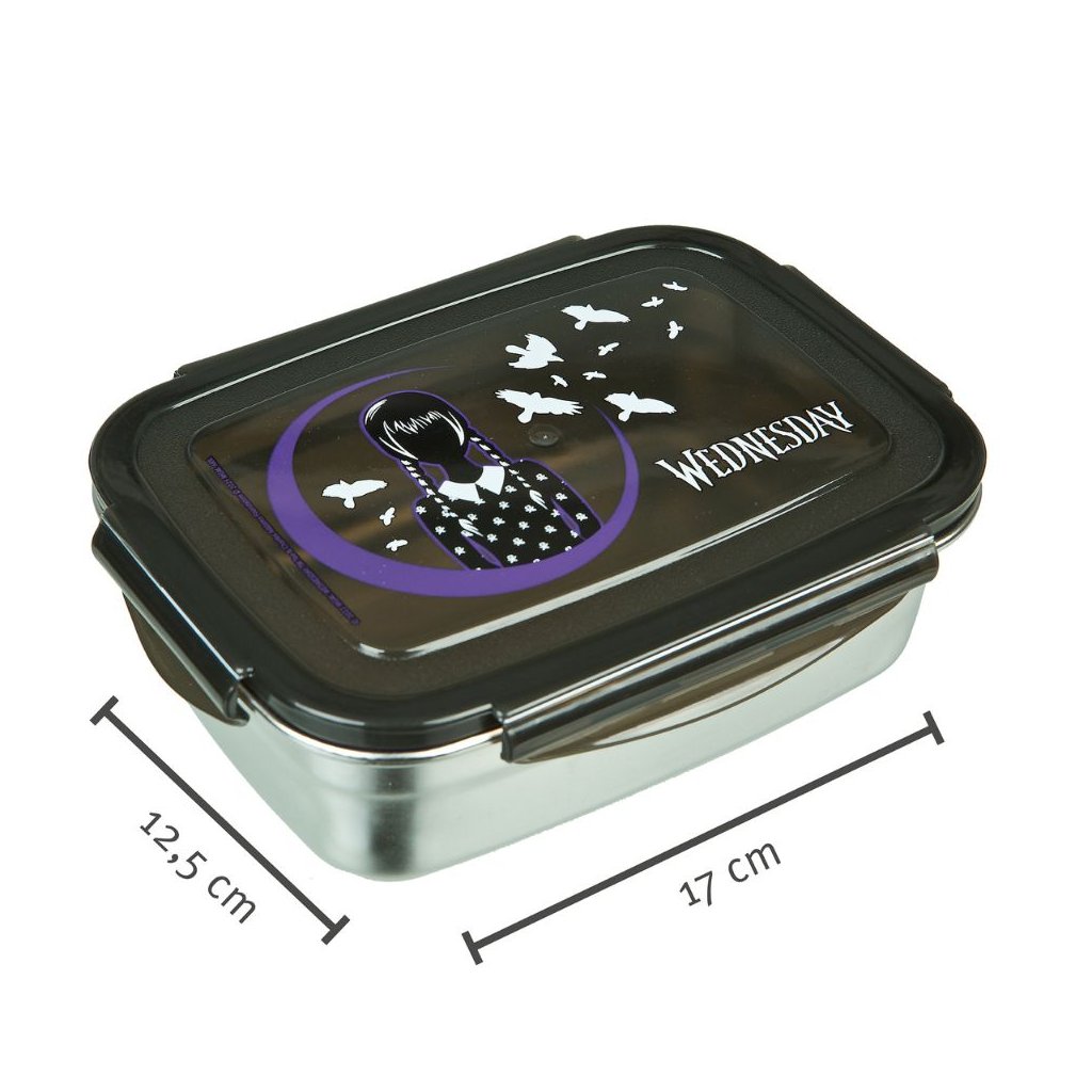 Svačinový box s motivem Wednesday v praktickém provedení z nerezové oceli a s průhledným víkem. Objem 550 ml poskytuje dostatek místa na oběd nebo svačinu do školy i na výlety. Kompaktní rozměry a odolný materiál z něj dělají spolehlivého parťáka pro každý den – s nádechem temného stylu Wednesday.