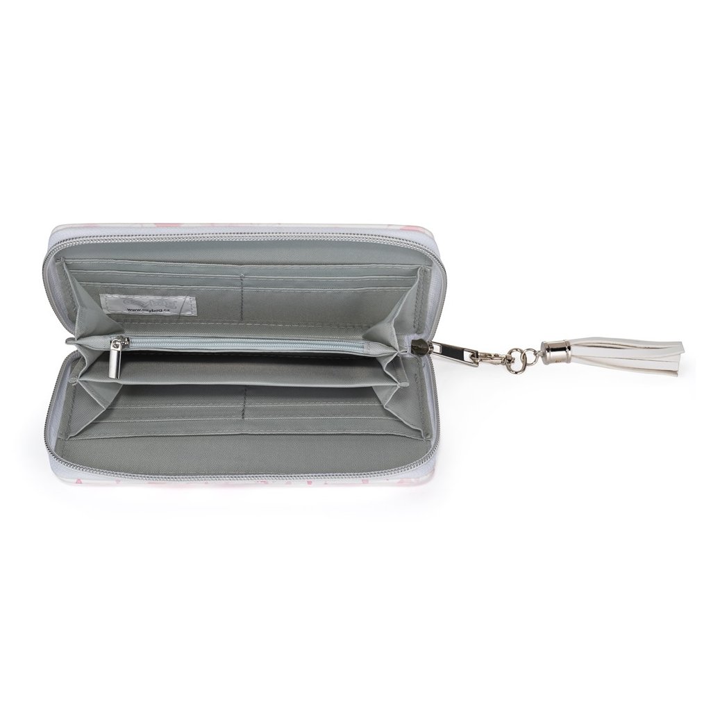 Velká dámská peněženka v květinovém provedení. Uvnitř je 8 menších kapes na věrnostní karty, 2 větší kapsy, 3 oddělené přihrádky na hotovost a 1 uzavíratelná kapsa na zip na drobné mince.