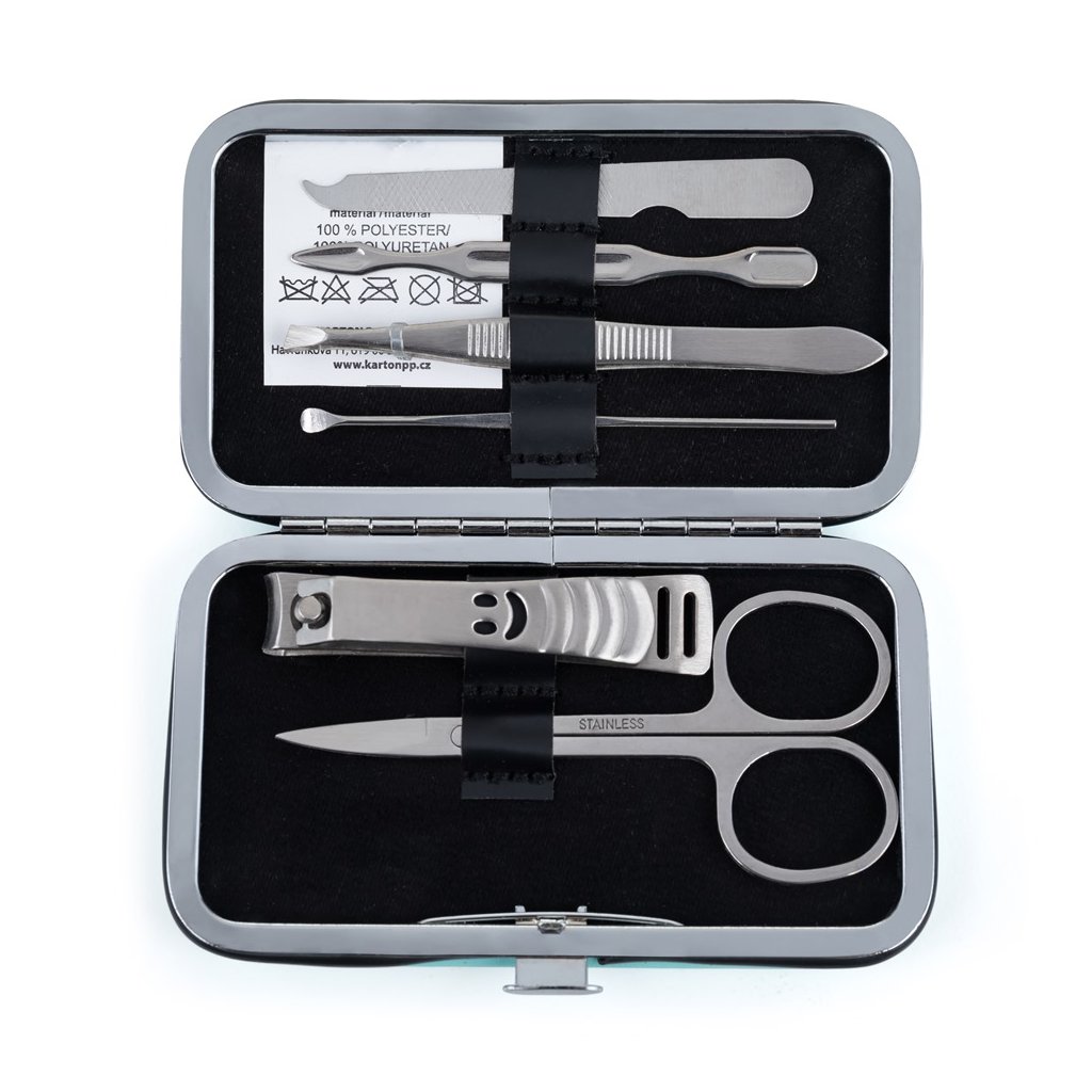 Cestovní manikúrní set (6 ks) – kvalitní stříbrná sada obsahující nůžky, kleštičky, pinzetu, pilník, manikúrní tyčinku a zatlačovač kůžičky.