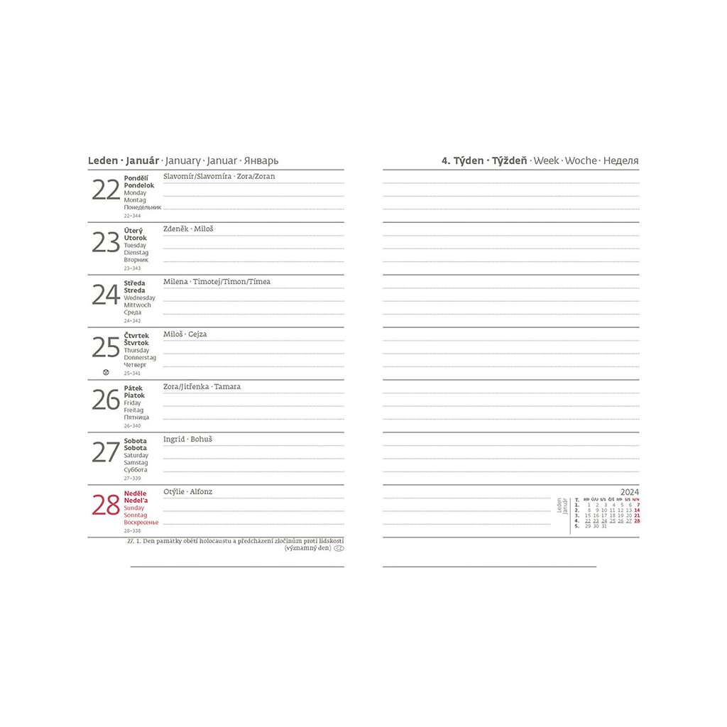 Diář obsahuje týdenní kalendárium, plánovací kalendář, přehledný kalendář, důležitá telefonní čísla, místo pro poznámky.