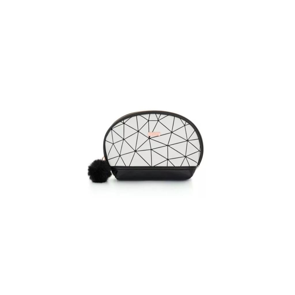 Cestovní kulatá kosmetická taška v černobílém provedení. Vhodná k uskladnění toaletních a kosmetických potřeb menší velikosti. Rozměry: 15,5 x 14 x 7,5 cm