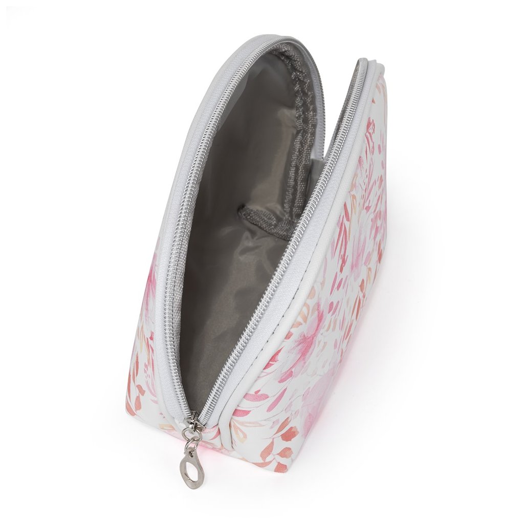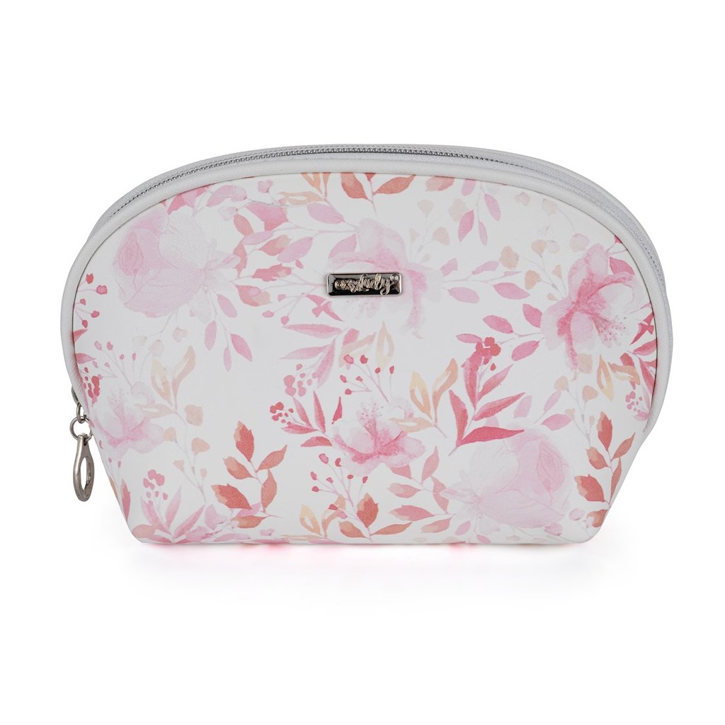 Cestovní kulatá kosmetická taška v květinovém provedení. Vhodná k uskladnění toaletních a kosmetických potřeb menší velikosti. Rozměry: 15,5 x 14 x 7,5 cm