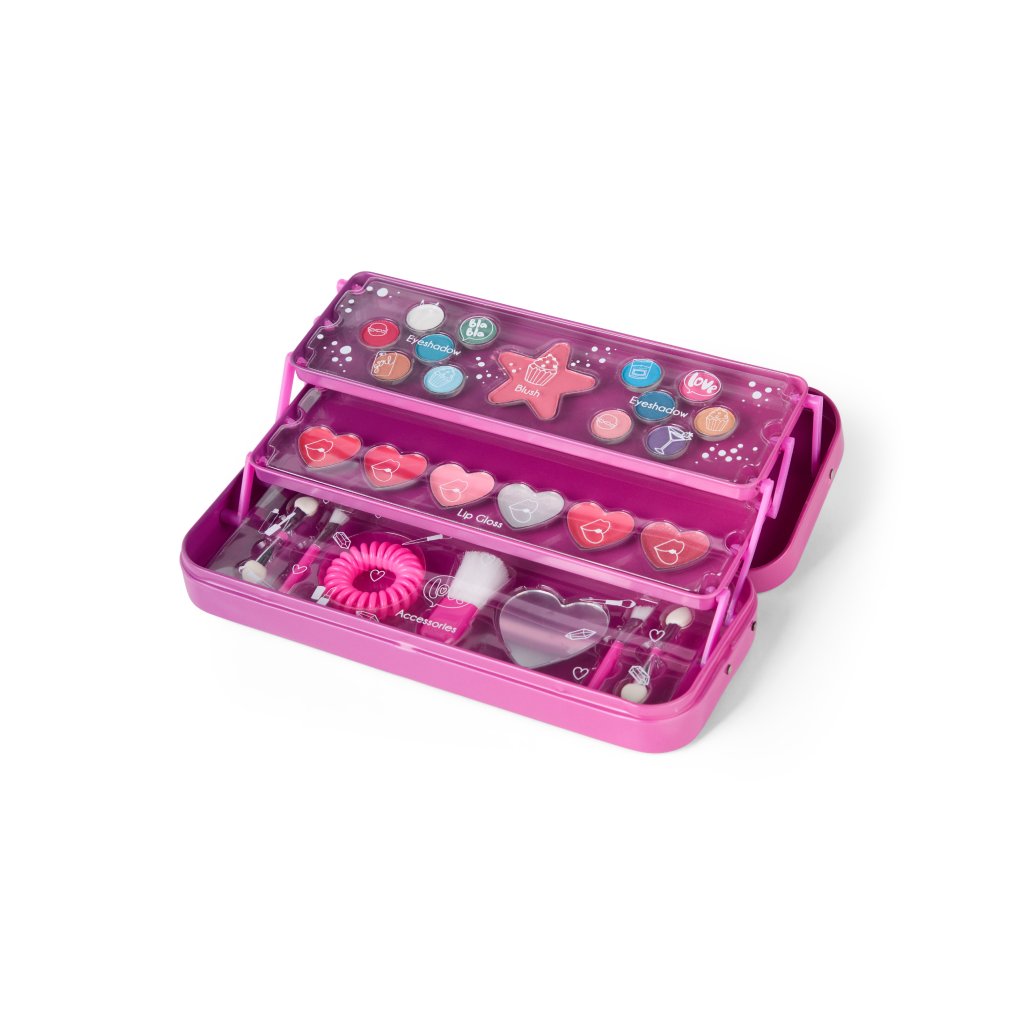 Třípatrová kovová kazeta s líčením – kompletní sada pro malé parádnice.