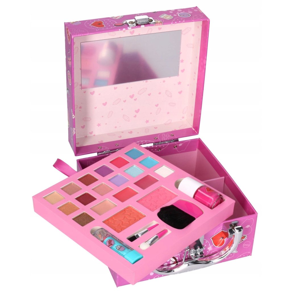 V horní části najdeš kompletní make-up sadu a pod ní praktický úložný prostor, kam si můžeš schovat další kosmetiku nebo oblíbené doplňky. Kufřík je skvělý na prázdniny i na přespání u kamarádky, všechny produkty zůstanou díky pevnému obalu bezpečně uložené.