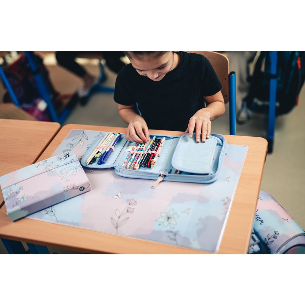Dostatek úložného prostoru: dvě chlopně pojmou tužky, pera, pastelky, zvýrazňovače a další školní pomůcky.
