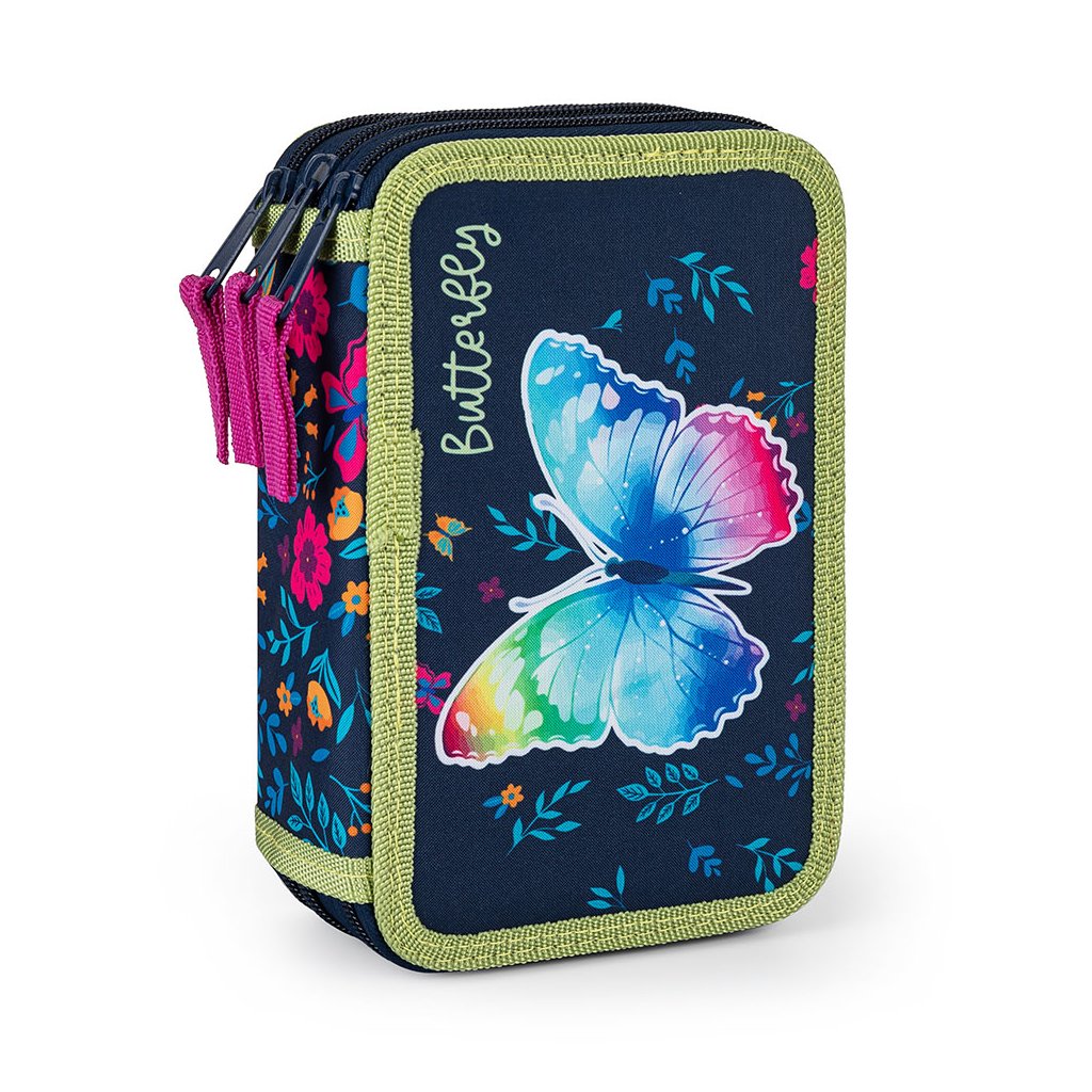 Třípatrové školní pouzdro s gumovými poutky a stylovým designem, které pojme všechny psací, kreslící a rýsovací potřeby, udrží je přehledně uložené a stane se nepostradatelným společníkem každého školáka.