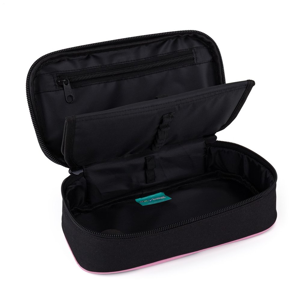 Toto školní pouzdro je vybaveno pevnými zipy pro bezpečné uzavření, uzavíratelnou kapsičkou na zip pro drobnosti, přihrádkou na pravítko a klopou s šesti poutky na psací potřeby. Pod klopou najdete také místo pro volné uložení dalších psacích potřeb či jiných drobností.