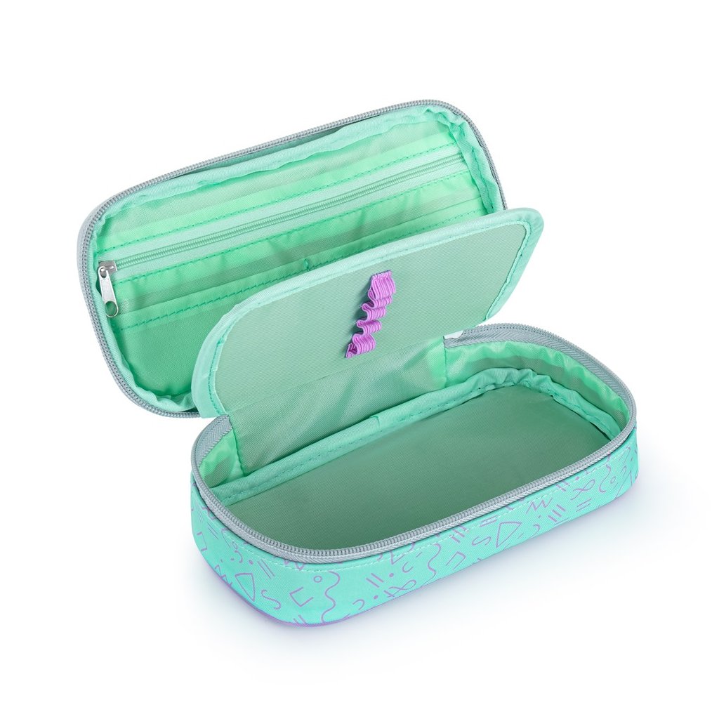 Pouzdro etue má jednu komoru, zato velmi prostornou, což určitě oceníte. Vždy v ní najdete propisku, zvýrazňovač i tužku. Uvnitř se skrývá malá kapsička na zip. Prostřední klopa je opatřena gumovými poutky je opatřeno pevnými zipy, kapsičkou na zip a klopou s pevnými poutky po obou stranách. Pod klopou je místo pro volné uložení psacích potřeb nebo jiných drobností.