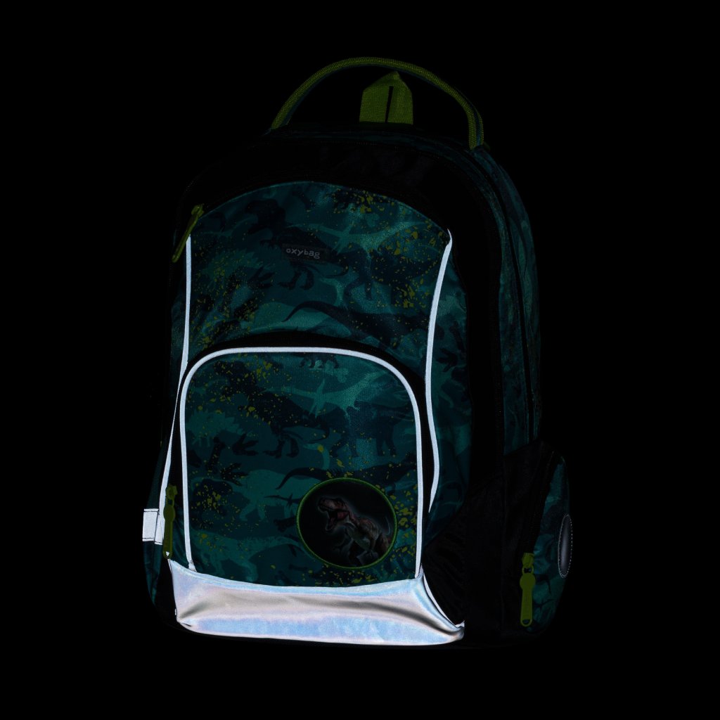 Školní set aktovky OXY GO Dino s jednopatrovým penálem a sáčkem na přezůvky.