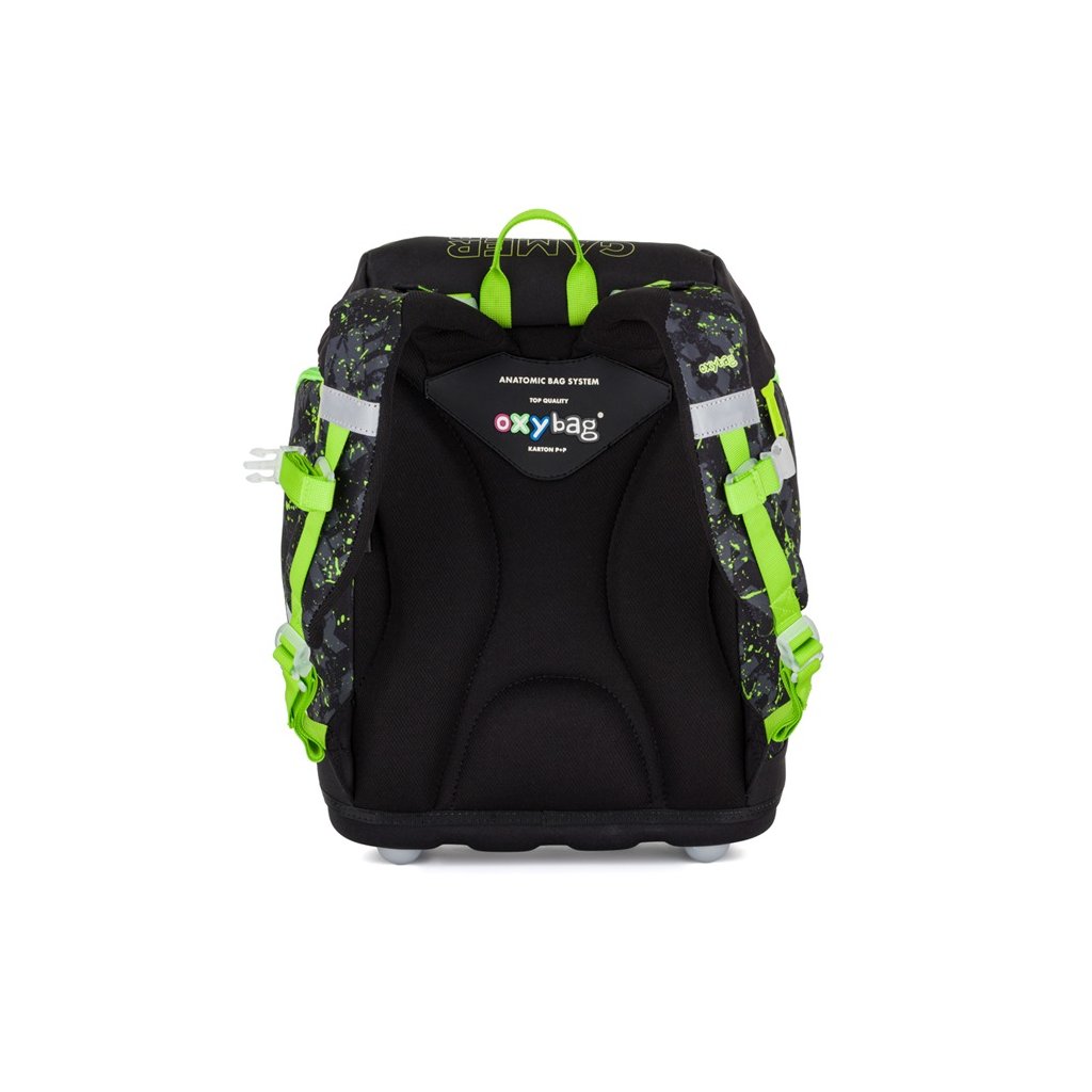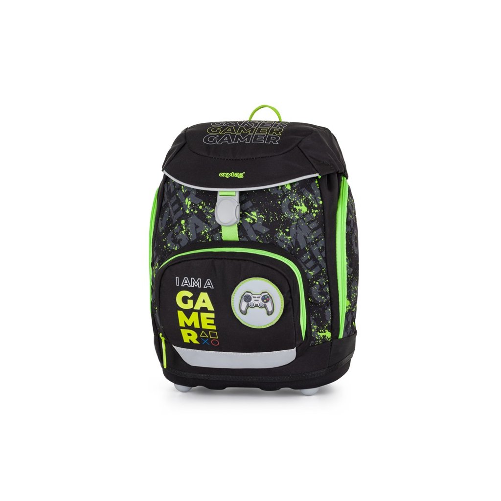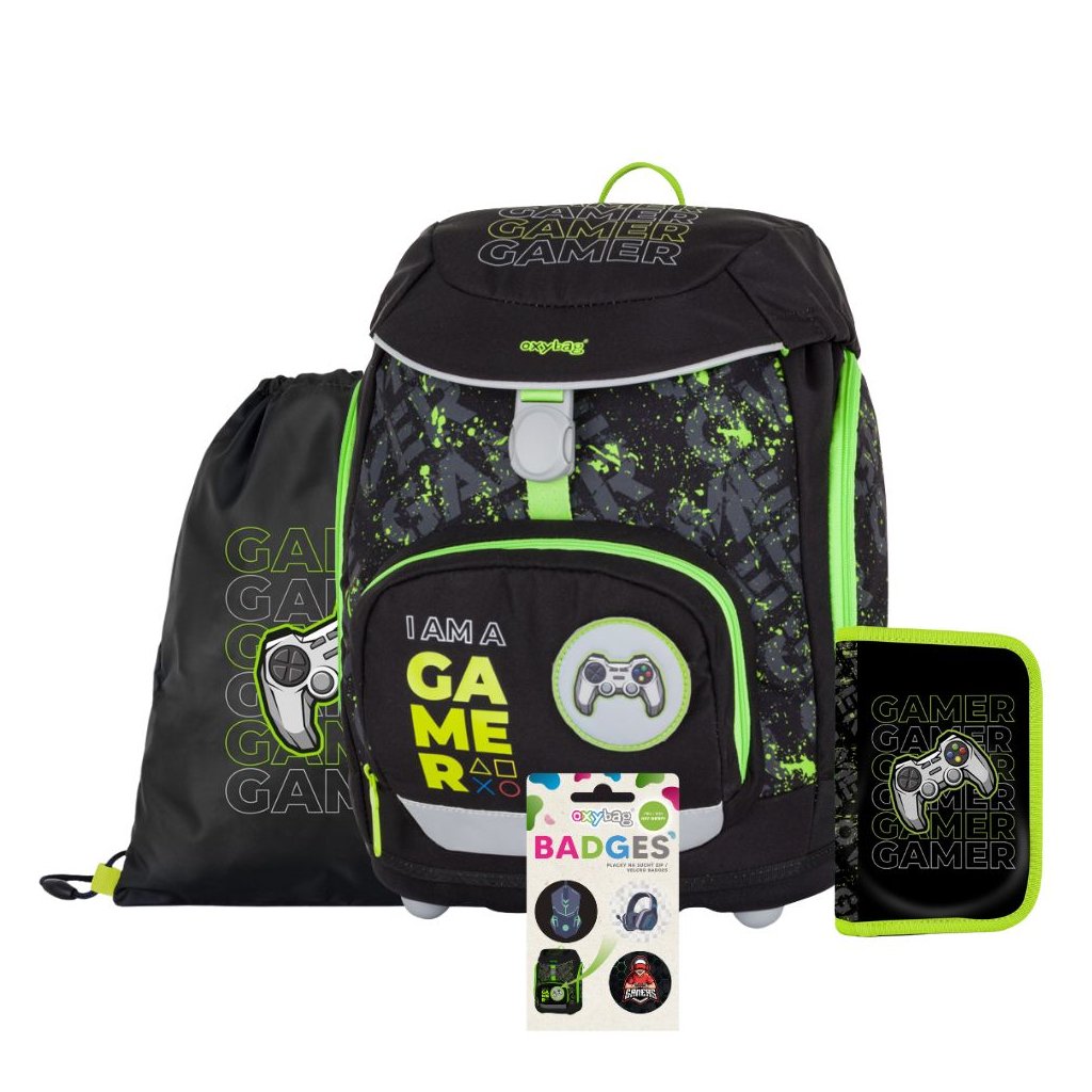 Školní set aktovky OXY Sherpy s jednopatrovým penálem, sáčkem na přezůvky a sadou vyměnitelných placek.
