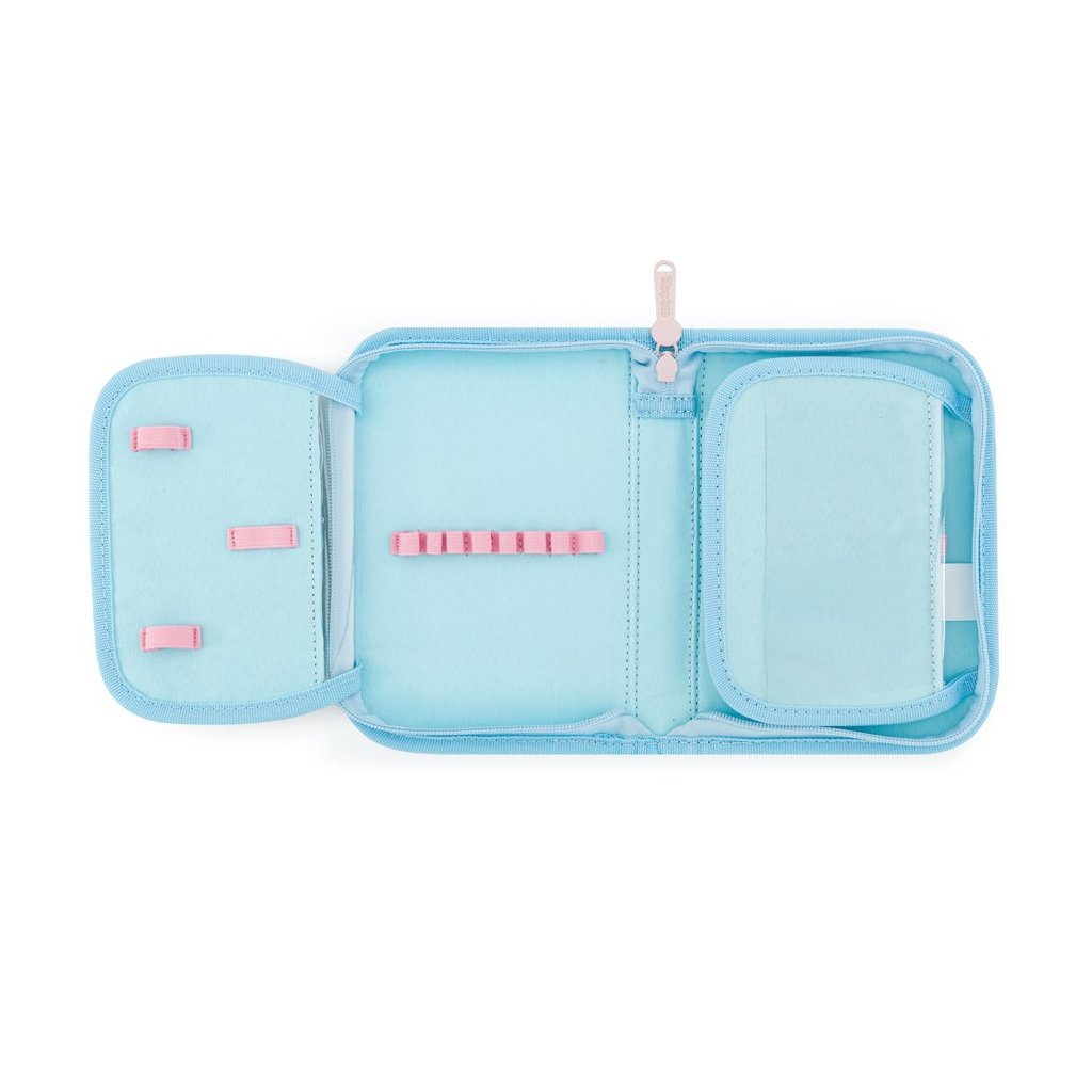 Jednopatrový penál s dvěma chlopněmi a gumovými poutky k uchycení psacích potřeb. Na vnitřní chlopni je průhledná fólie pro jednoduchý přehled rozvrhu hodin. Penál je bez náplně, aby byl připraven na oblíbené psací potřeby vašich malých školáků.