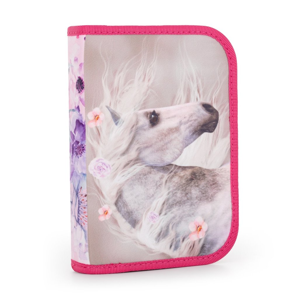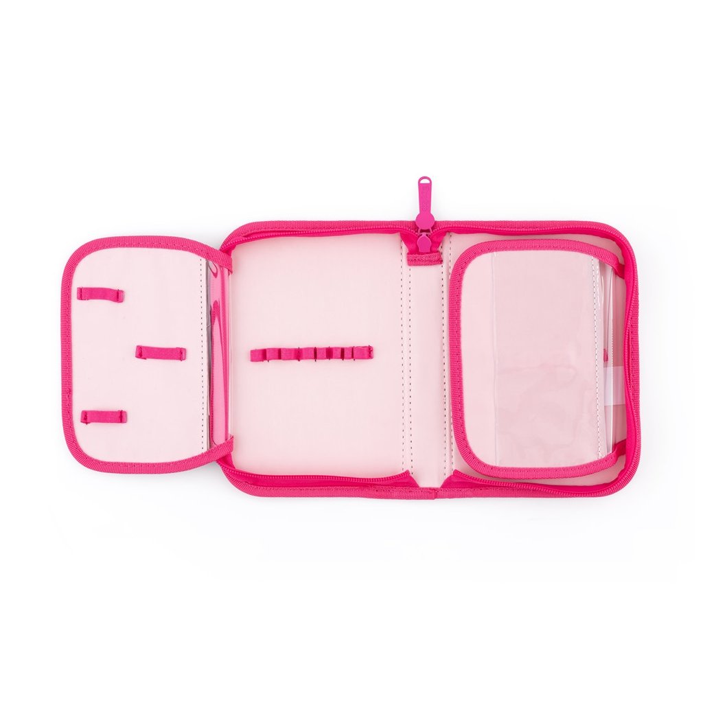 Jednopatrový penál s dvěma chlopněmi a gumovými poutky k uchycení psacích potřeb. Na vnitřní chlopni je průhledná fólie pro jednoduchý přehled rozvrhu hodin. Penál je bez náplně, aby byl připraven na oblíbené psací potřeby vašich malých školáků.