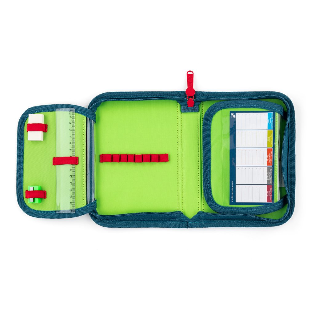 Jednopatrový školní penál se 2 chlopněmi, prázdný obsahuje 25 gumových poutek pro uchycení psacích potřeb. Na vnitřních chlopních jsou průhledné fólie pro rozvrh hodin.