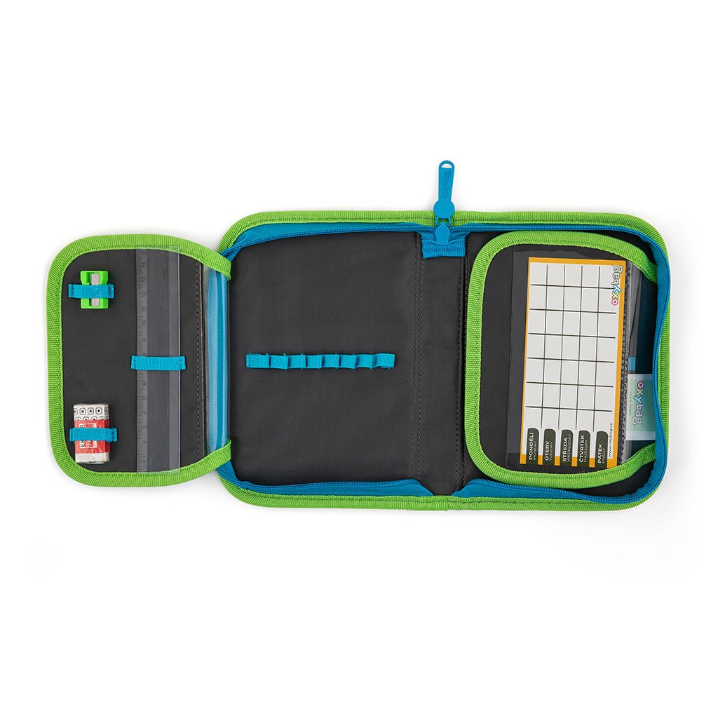 Jednopatrový školní penál se 2 chlopněmi, prázdný obsahuje 25 gumových poutek pro uchycení psacích potřeb. Na vnitřních chlopních jsou průhledné fólie pro rozvrh hodin.