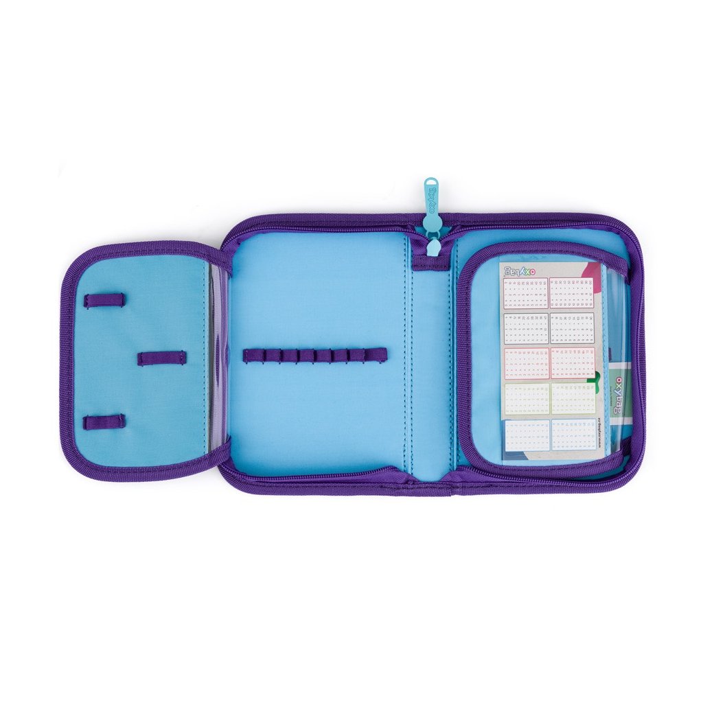 Jednopatrový penál s dvěma chlopněmi a gumovými poutky k uchycení psacích potřeb. Na vnitřní chlopni je průhledná fólie pro jednoduchý přehled rozvrhu hodin. Penál je bez náplně, aby byl připraven na oblíbené psací potřeby vašich malých školáků.