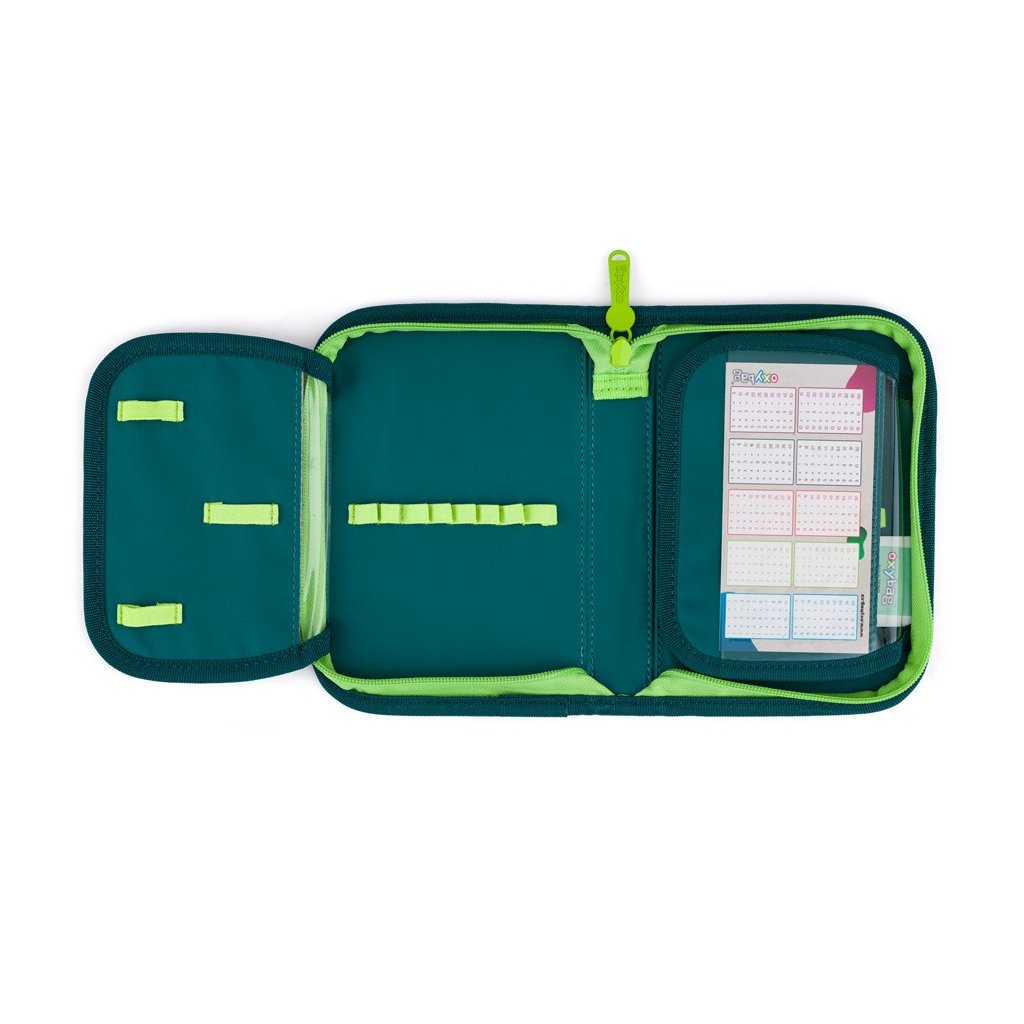 Jednopatrový penál s dvěma chlopněmi a gumovými poutky k uchycení psacích potřeb. Na vnitřní chlopni je průhledná fólie pro jednoduchý přehled rozvrhu hodin. Penál je bez náplně, aby byl připraven na oblíbené psací potřeby vašich malých školáků.