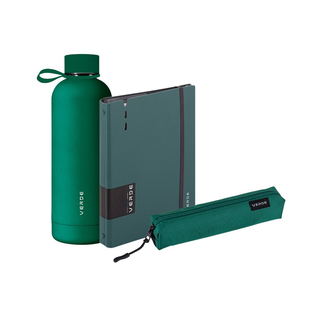 Stylový 3dílný set z kolekce VERDE obsahuje termosku, blok a pouzdro etue. Elegantní design vhodný do školy, kanceláře i na cesty, ideální jako dárek pro studenty, kolegy nebo přátele.